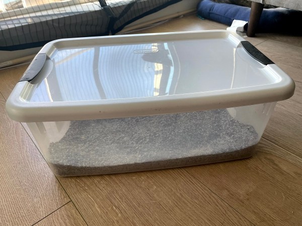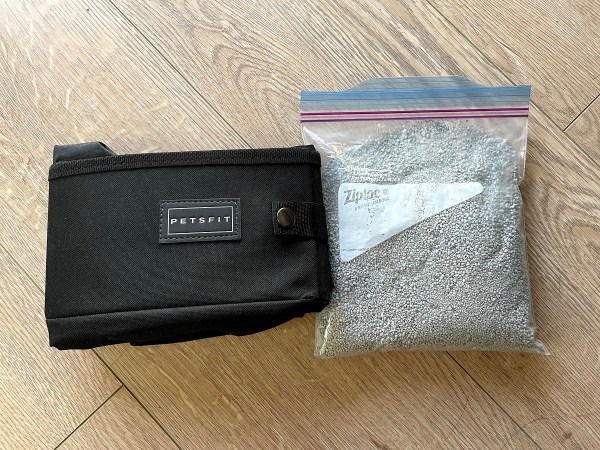We previously brought Zara’s entire litter box in the car, which was annoying since it’s open top, but a plastic bin with a lid seems great! Our cat carrier bag came with a little travel litter box that she’s used before when out at a park, but our adventures are pretty short and close to home.