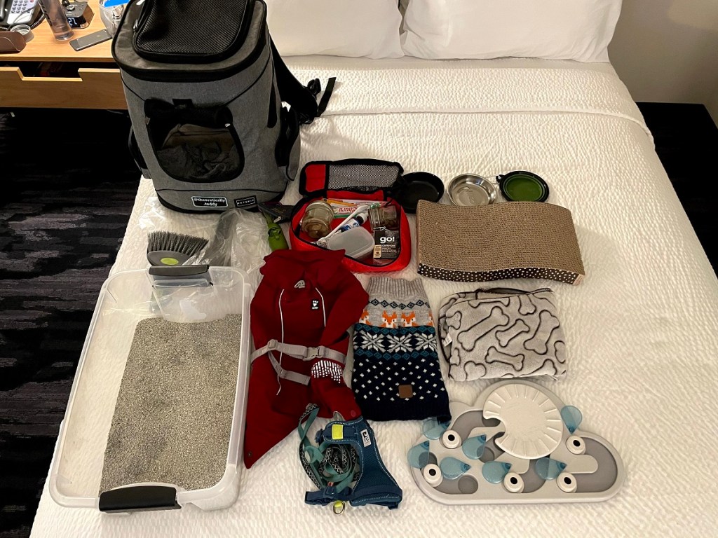 No need to bring a separate bed, since your carrier or backpack can double as a bed. - Set up the litter box in the washroom and use a towel as a litter mat (or bring your own)