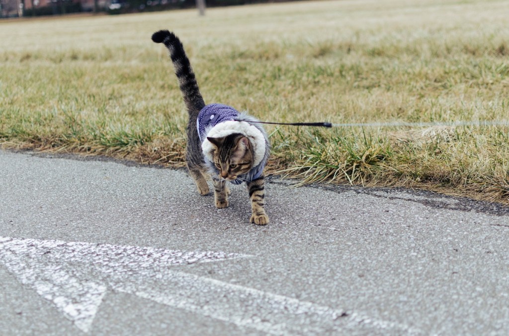 For a beginner cat walker, exploring the neighbourhood close to home is a great idea. Cats are generally territorial and feel safer in their home territory. This also allows them to turn around and go home if they feel overwhelmed.
