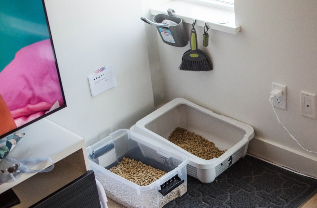 I use the most of my vertical space by hanging all the cat litter accessories including the scoop, litter bag, and dustpan. This saves a lot of storage space!
