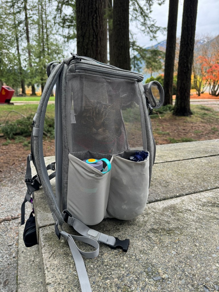 - Storage Pockets: The storage pockets is what sold me and why I use this backpack as my main cat backpack. There are two bottle holders (which I use to carry items such as water bottles, tripods, snacks, extra leashes and clothing), and a closed zipper space for storing more valuable items (such as a phone, wallet, or keys). Although it is nowhere near enough for bringing everything I would usually bring while hiking, for short walks the pockets are the best.