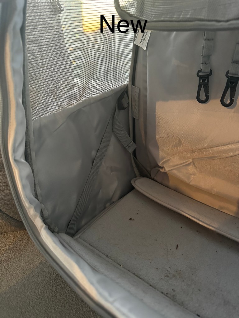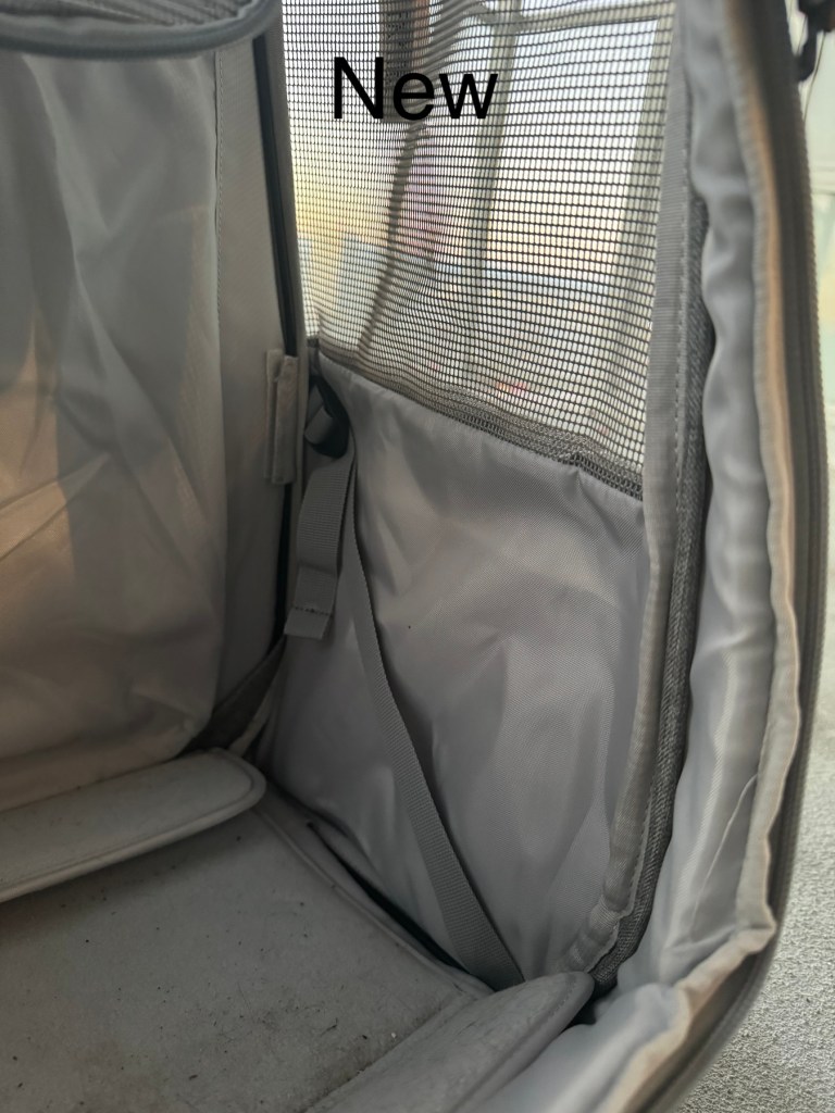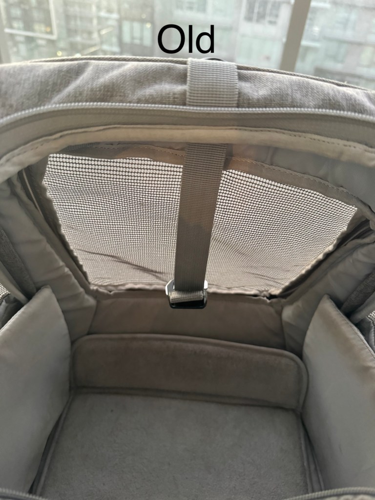 The new version is about 2″ taller, 1″ wider, and 1″ less deep. The new size fits perfectly on most airlines including Air Canada. This means more space for your cat, but also a little bulkier to carry. The shoulder straps have a sliding adjustment instead of the old loops. The pockets are exactly the same in design.
